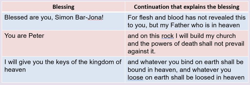 There can be much said about this. Jimmy Akin refers to this text as one of the passages he “put on the shelf” when he was studying to be a Presbyterian minister. When his wife reconverted to the Catholic faith of her youth and thereby derailed his opportunity to be ordained, he took those passages and began to seriously study them. One of the things he noticed about Matthew 16:18-19 is Christ made three different statements to Peter when he professed Jesus is the Christ, the son of the living God. Each statement begins with a blessing, and then has a “continuation” in the text that further explains the blessing: