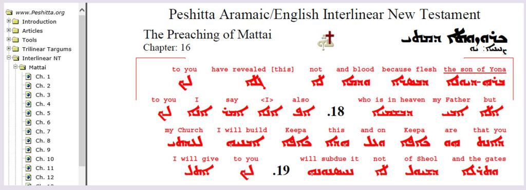 One response Catholics will sometimes make to this claim is Christ in all likelihood was not speaking in Greek, but would have been speaking in Aramaic. In that exchange, the Aramaic word Cephas (or Keepa) would have been used for both Peter’s name and the word “rock.” And if you look at an Aramaic Bible today (as below) you can see this would be true.